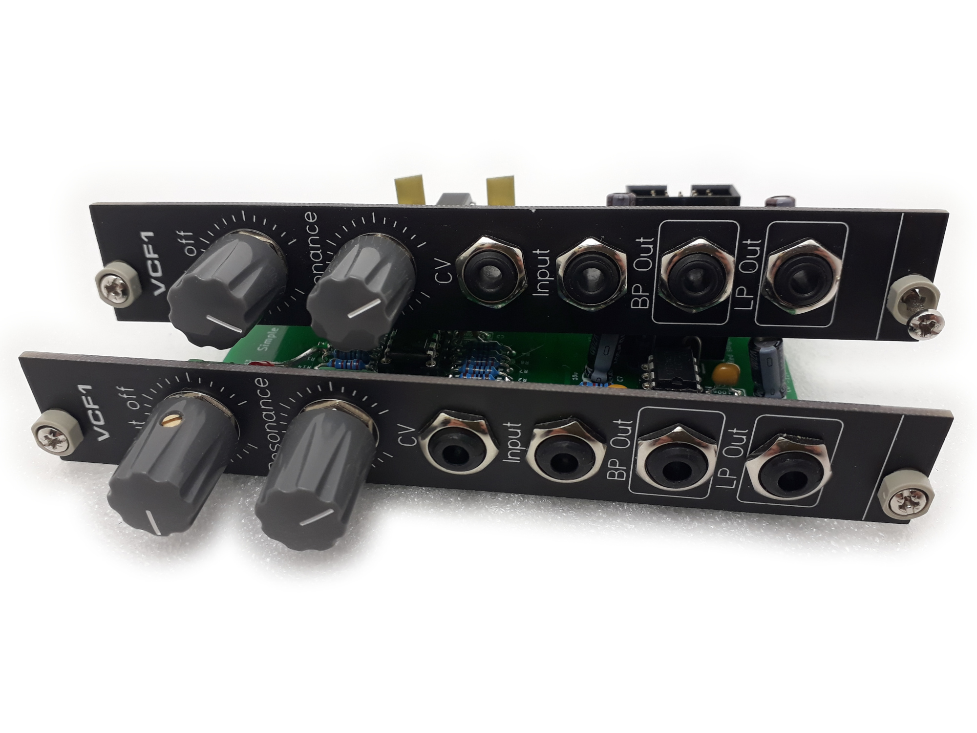 The Simple VCF was an early project, an attempt to replicate the low-pass/high-pass filter from the original MFOS Sound Lab Mini-Synth.