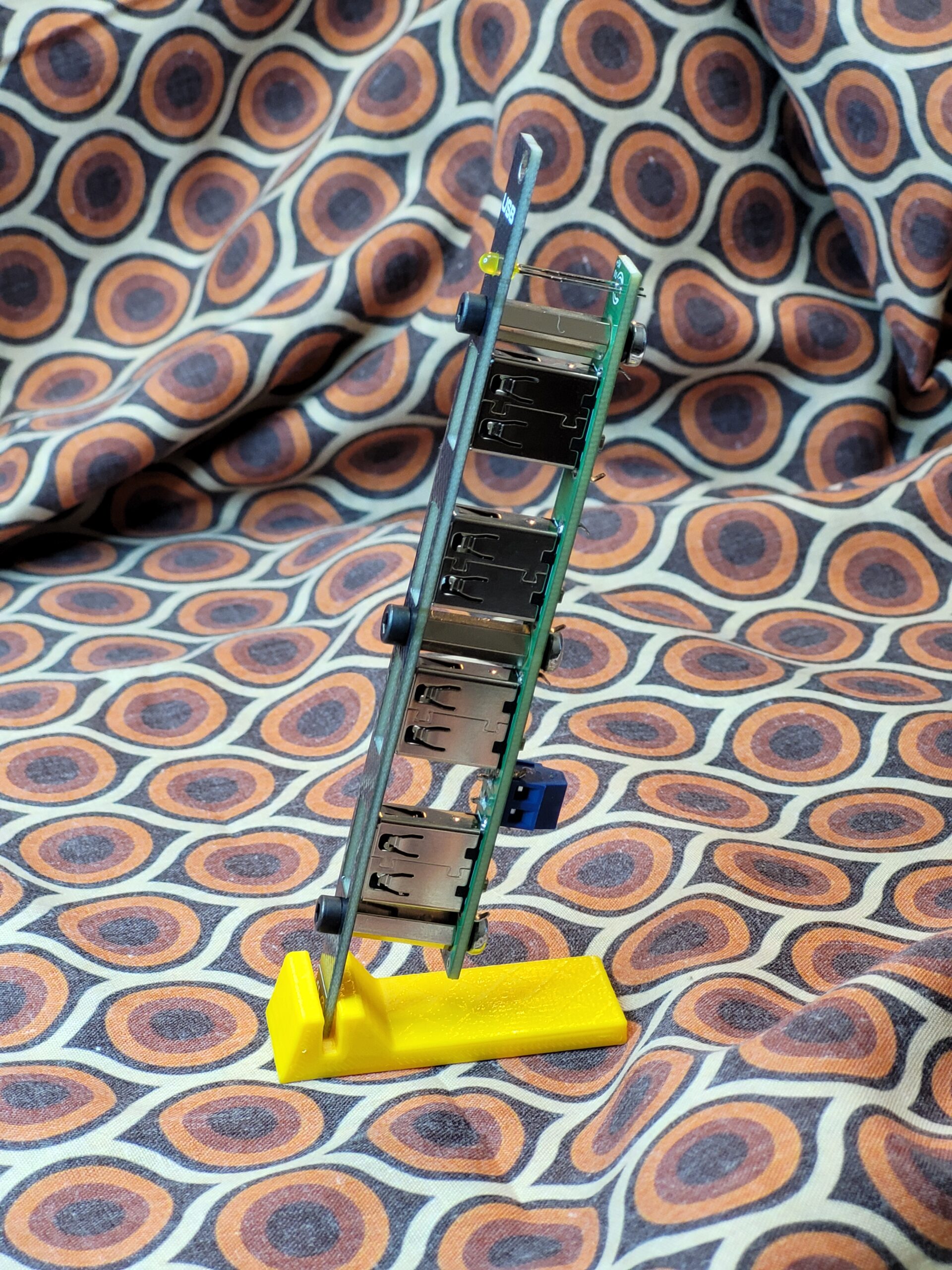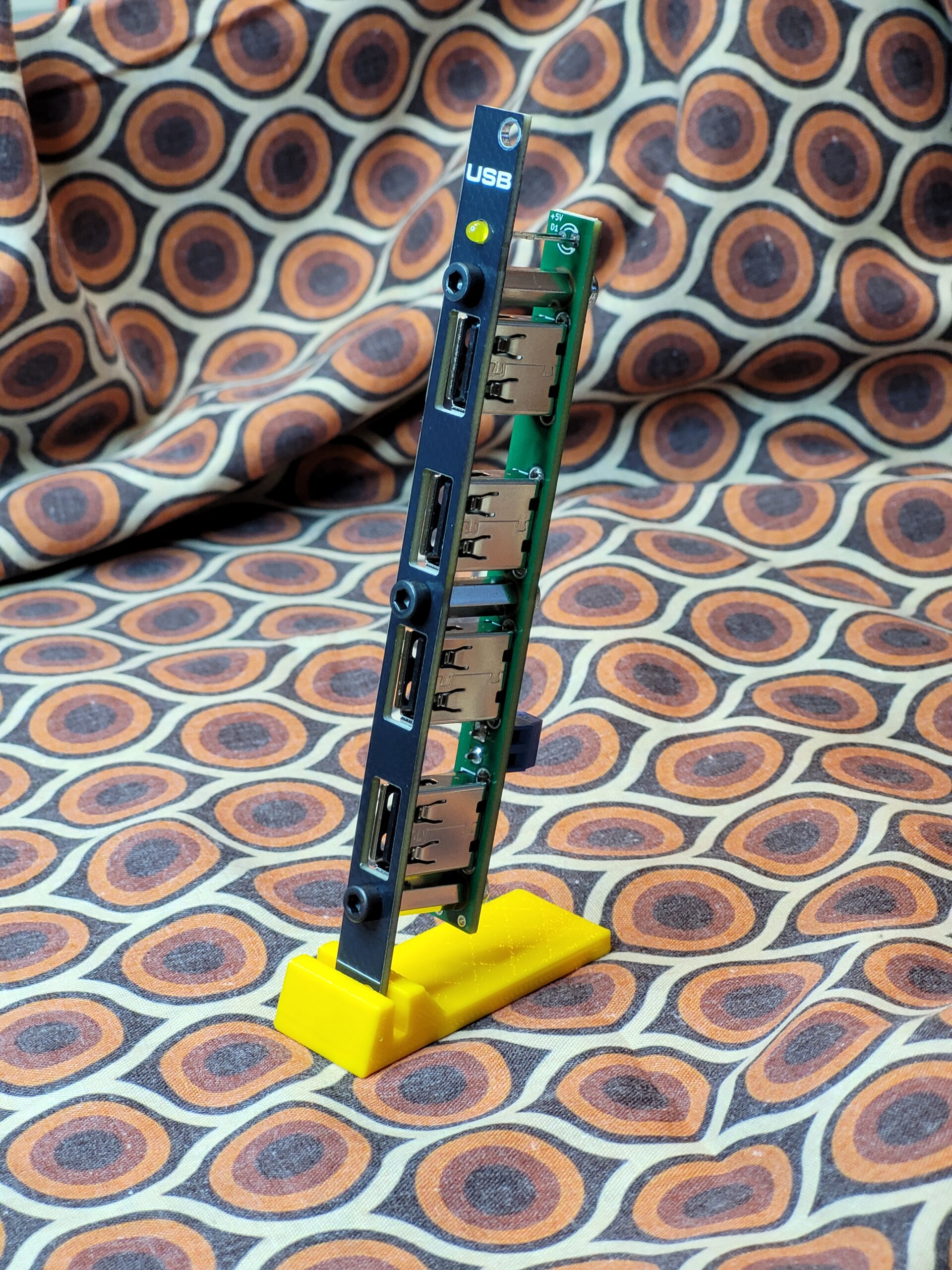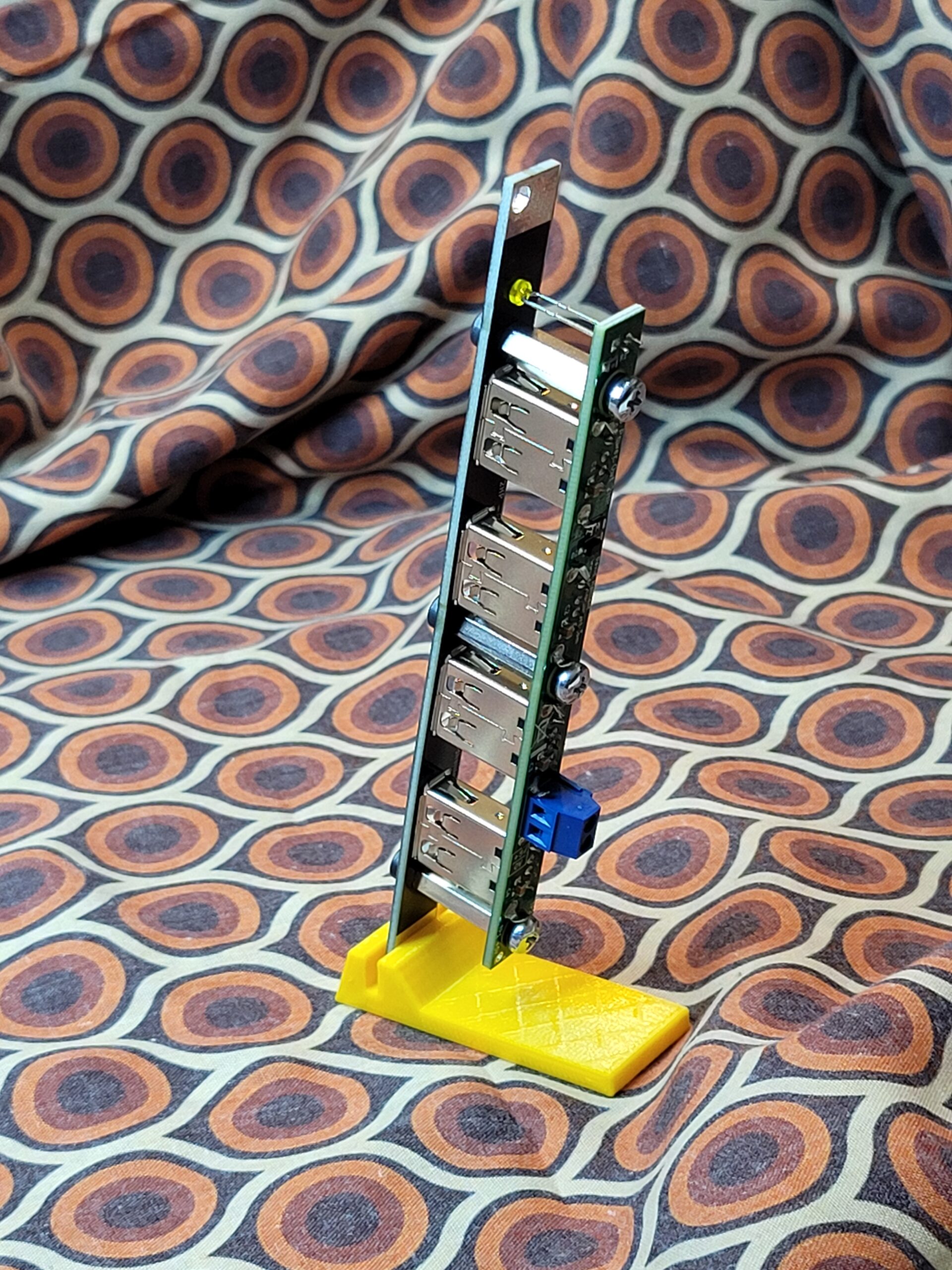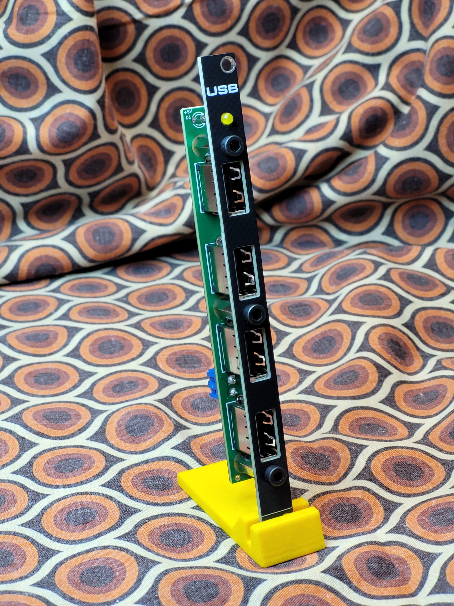 The USB Power Output is a simple 2HP wide utility module with 4 USB A connectors. Perfect for powering a lamp, a small Keyboard (I use it for my Arturia Keystep) or anything else.